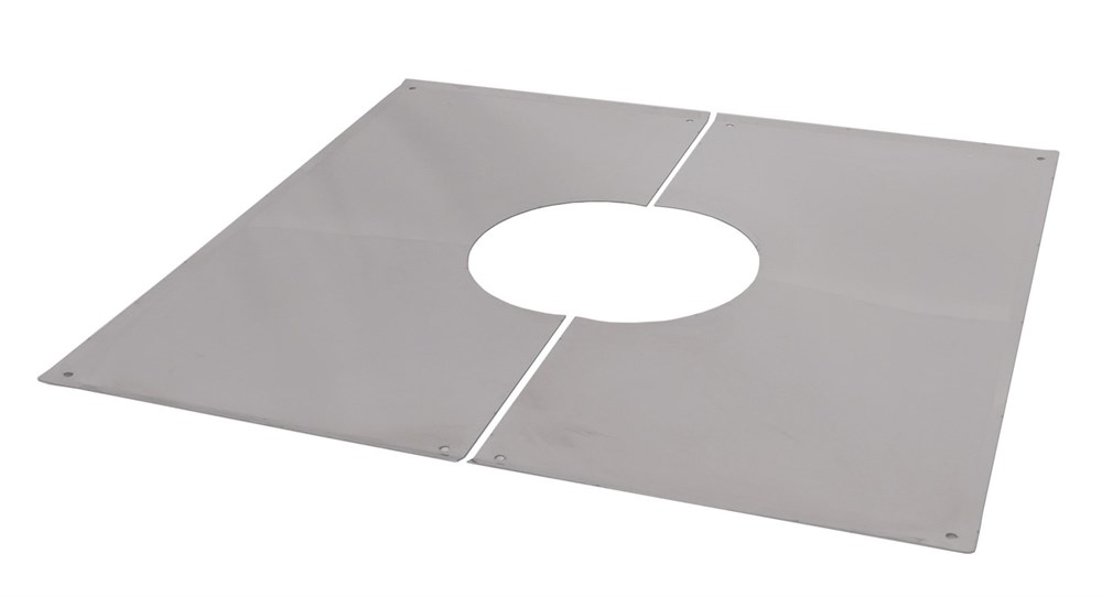 Пластина к ППУ представляет собой две пластины с отверстием под диаметр трубы, который предназначен для устройства прохода через внутреннюю часть крыши с целью дополнительной фиксации оси дымохода при прохождении крыши и придания эстетического вида месту прохода дымохода через крышу с внутренней стороны (потолка чердачного или иного помещения).
