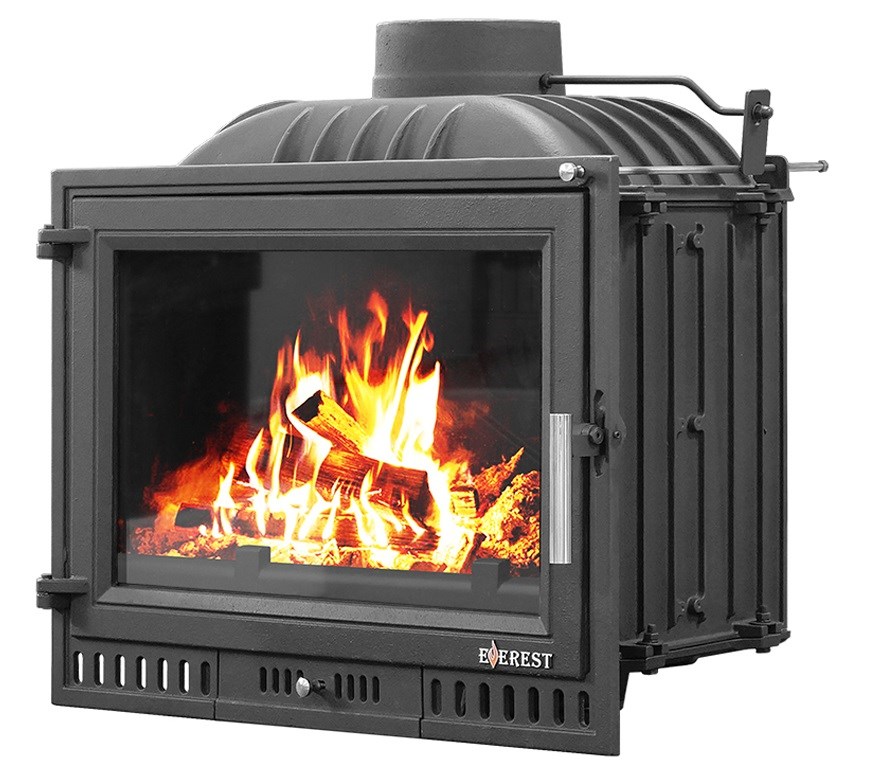 Каминная топка EVEREST Z14 изготовлена из качественного жаростойкого чугуна (ГОСТ 1412-85) с толщиной стенок 6-10 мм. Вес топки составляет 104 кг. Модель рассчитана на обогрев помещений объёмом до 280 м³. Топка усилена чугунными вставками с системой вторичного дожига. С помощью этой функции по каналам подачи вторичного воздуха поступает воздух, который нагревается при прохождении между топочной камерой и стенками корпуса. Далее нагретый воздух через дефлектор поступает в топку, перемешивается с газами - продуктами горения, чем вызывает повторное возгорание. Патрубок дымохода диаметром 180 мм не универсальный. оснащён поворотным шибером. Заслонка сделана из чугуна, а её положение регулируется ручкой на передней панели топки.
