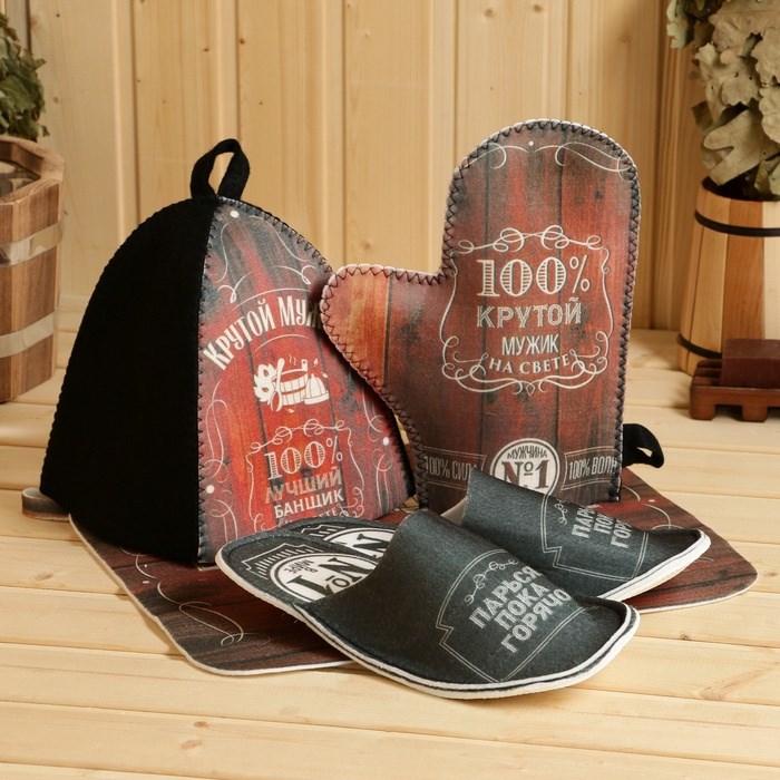 Набор для бани с принтом «Крутой мужик», 4 предмета: шапка, рукавица, тапочки, коврик, войлок, тёмный, «Банная забава»