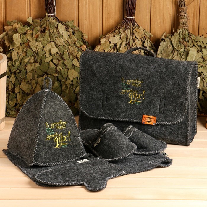 Набор для бани с вышивкой «В здоровом теле здоровый дух!», 5 предметов: портфель, шапка, рукавица, тапки, коврик