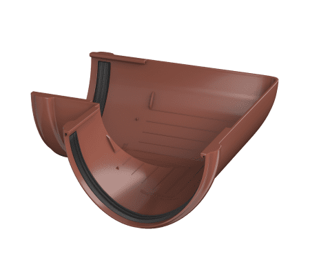 Элемент устанавливается на внешних и внутренних углах кровли и предназначен для соединения желобов под углом 90 градусов в целях изменения направления движения воды.