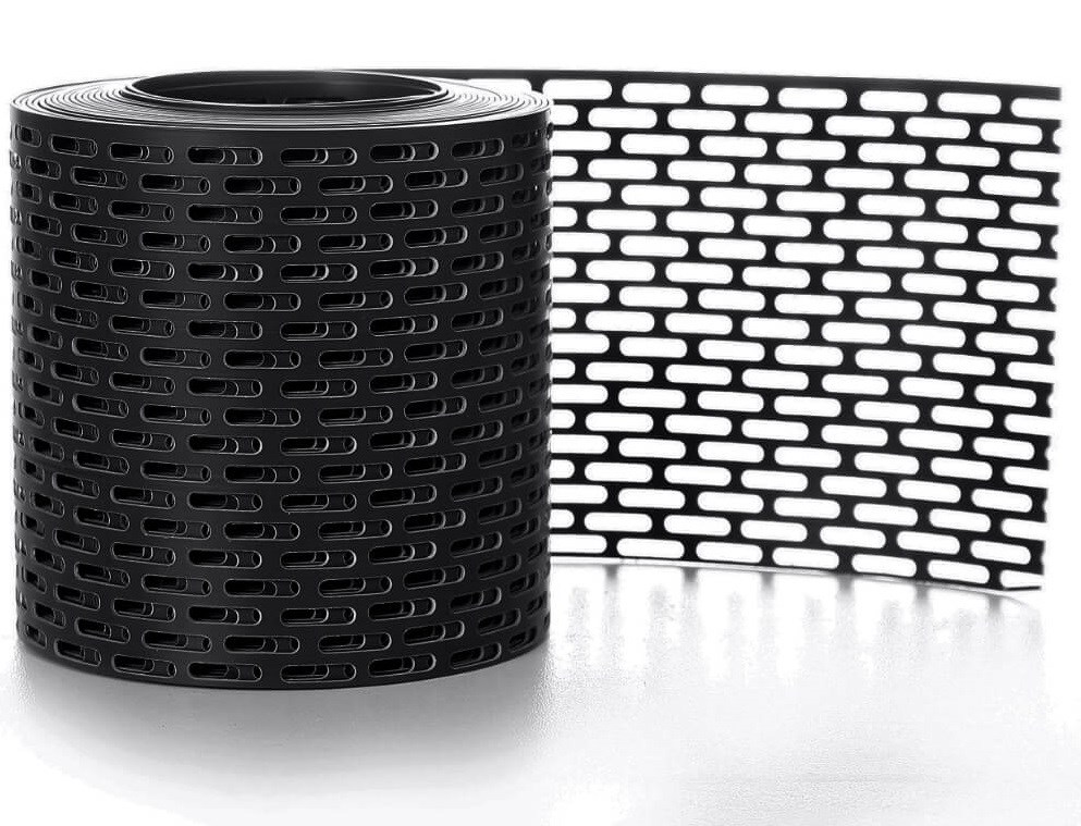 Вентиляционная лента для карнизного свеса представляет собой пластиковую ленту шириной 100 мм и длиной 5 м, имеющую овальные сетчатые отверстия для обеспечения свободного протока воздуха в подкровельное пространство. Общая площадь вентиляционных отверстий составляет 486 см2 на 1 п.м вентленты, что соответствует стандарту DIN EN 4108-3:2001. Изготовлена из морозостойкого полипропилена или ПВХ